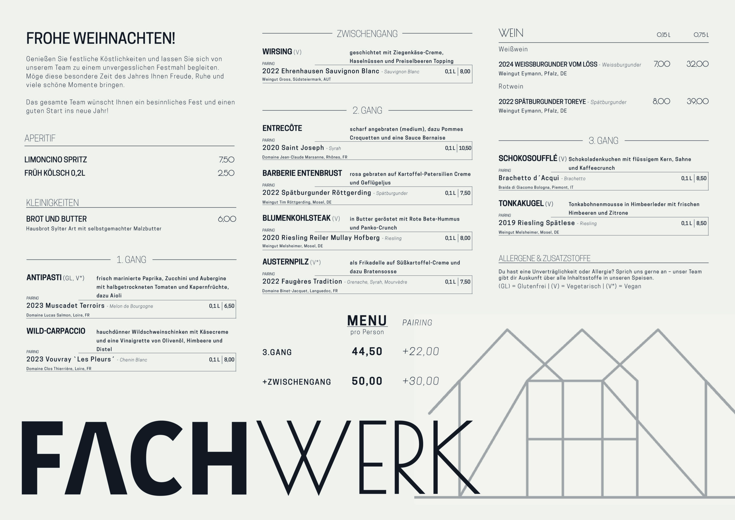 Das Fachwerk-Team ist vom 29. Dezember bis 18. Januar in den Betriebsferien und begrüßt Sie im nächsten Jahr wieder mit neuen Gerichten und dem passenden Wein.
